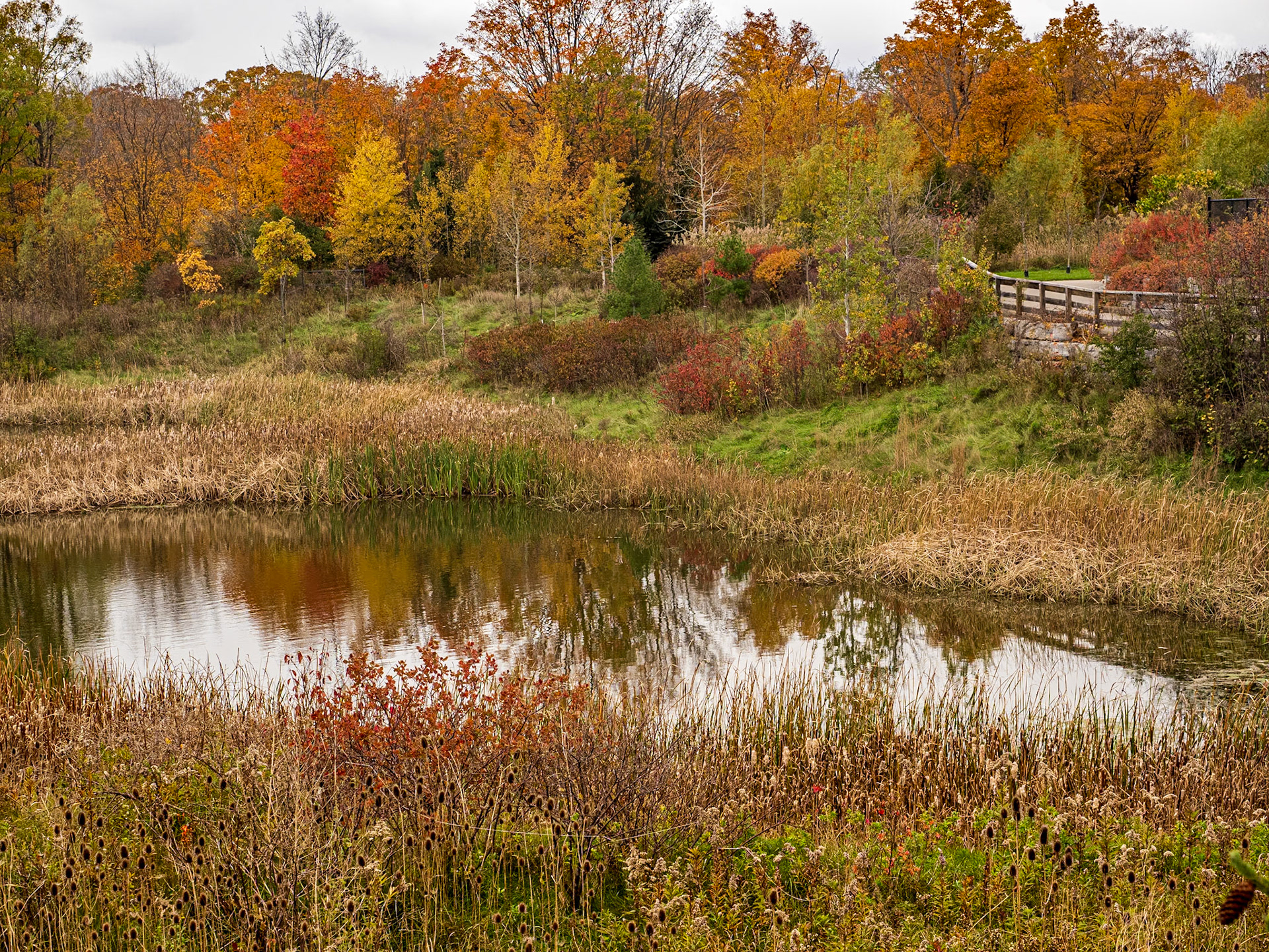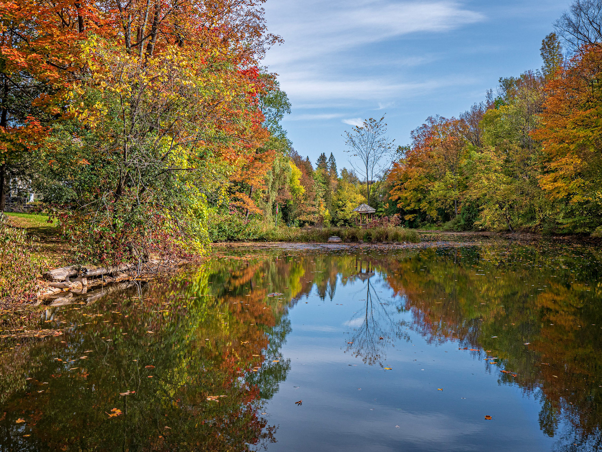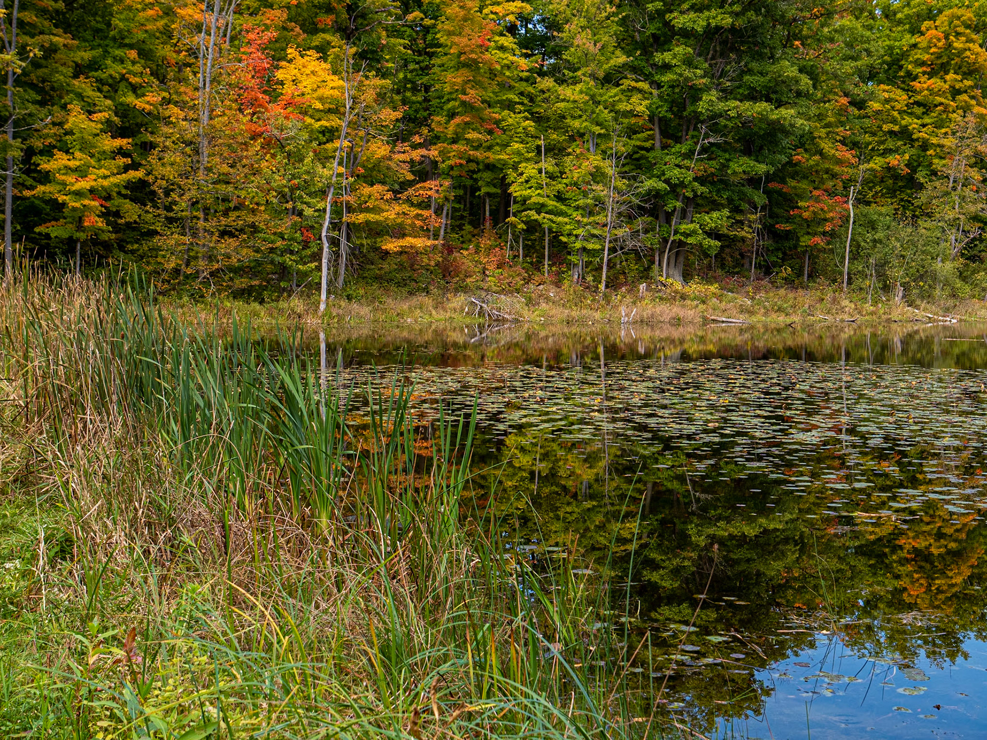 Fall colors reflected in the pond on the Tomahawk Golf Course in Thornbury, Ontario.