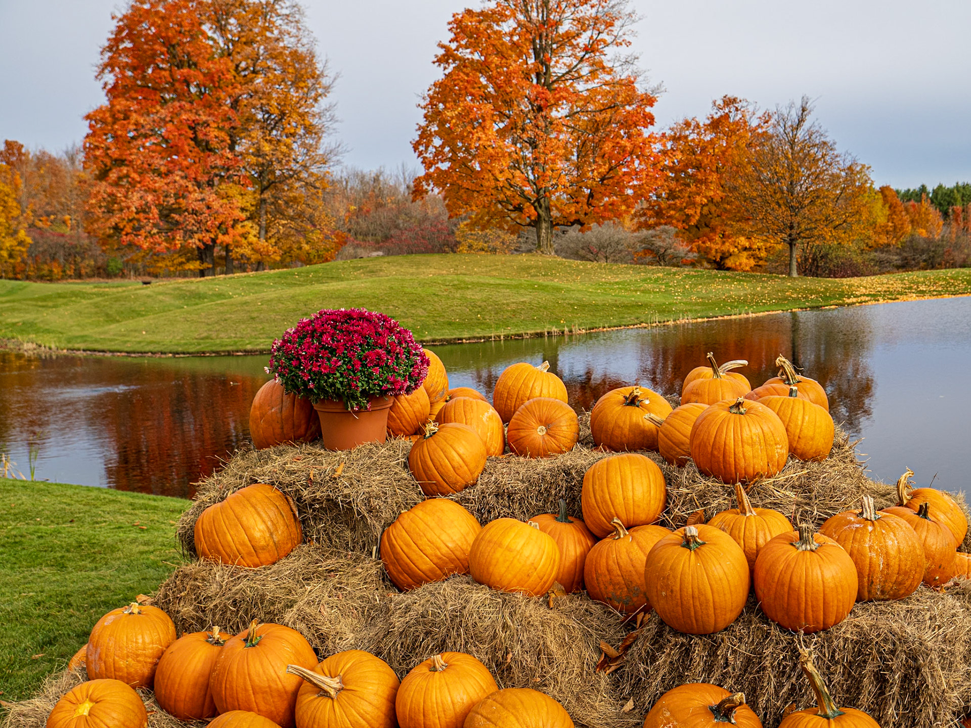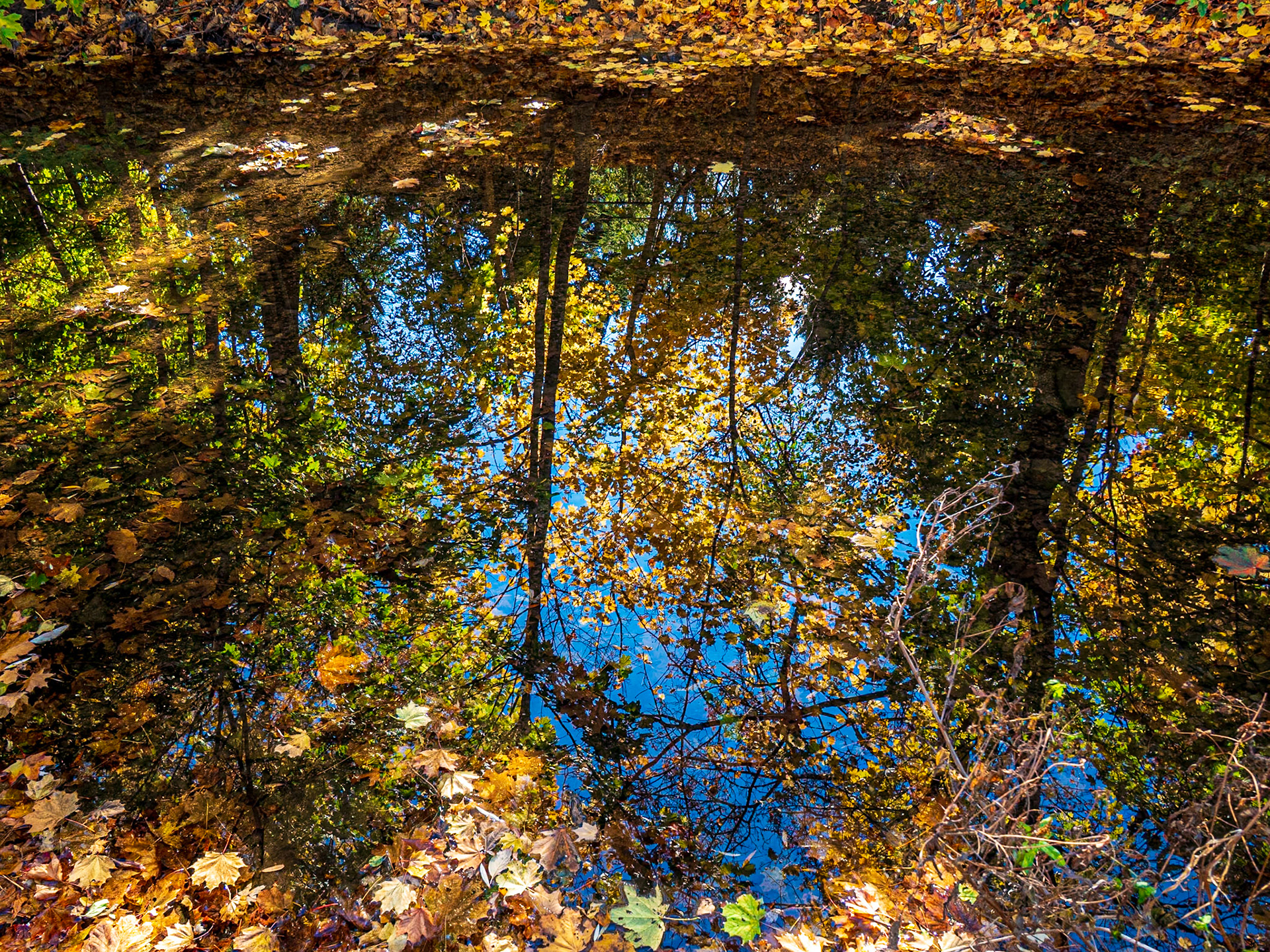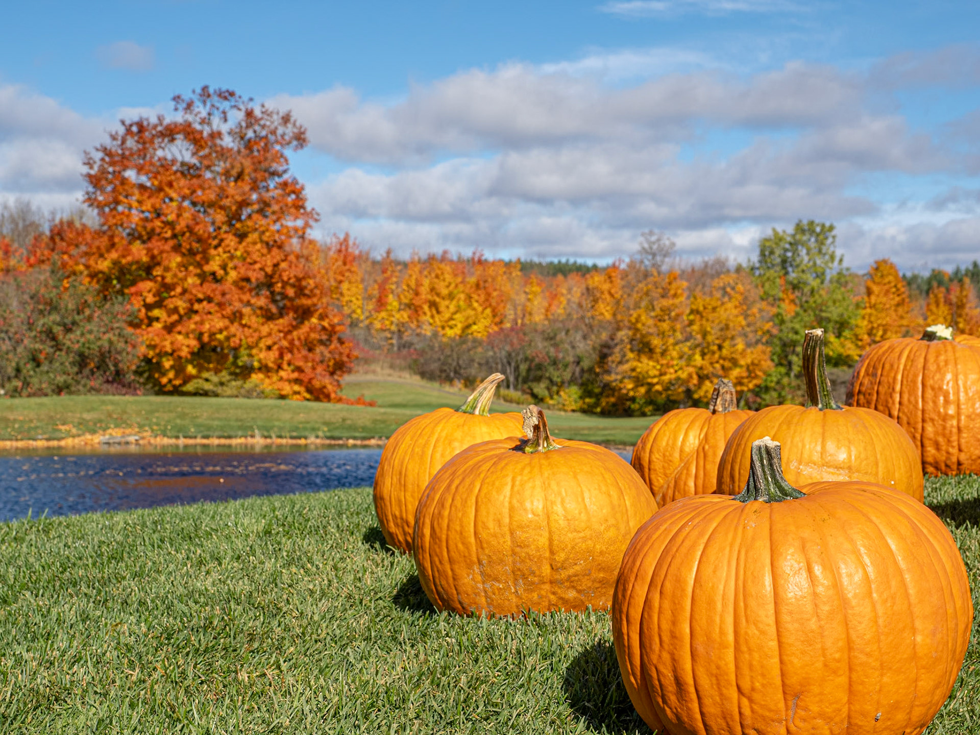 Fall colors reflected in the pond on the Tomahawk Golf Course in Thornbury, Ontario.