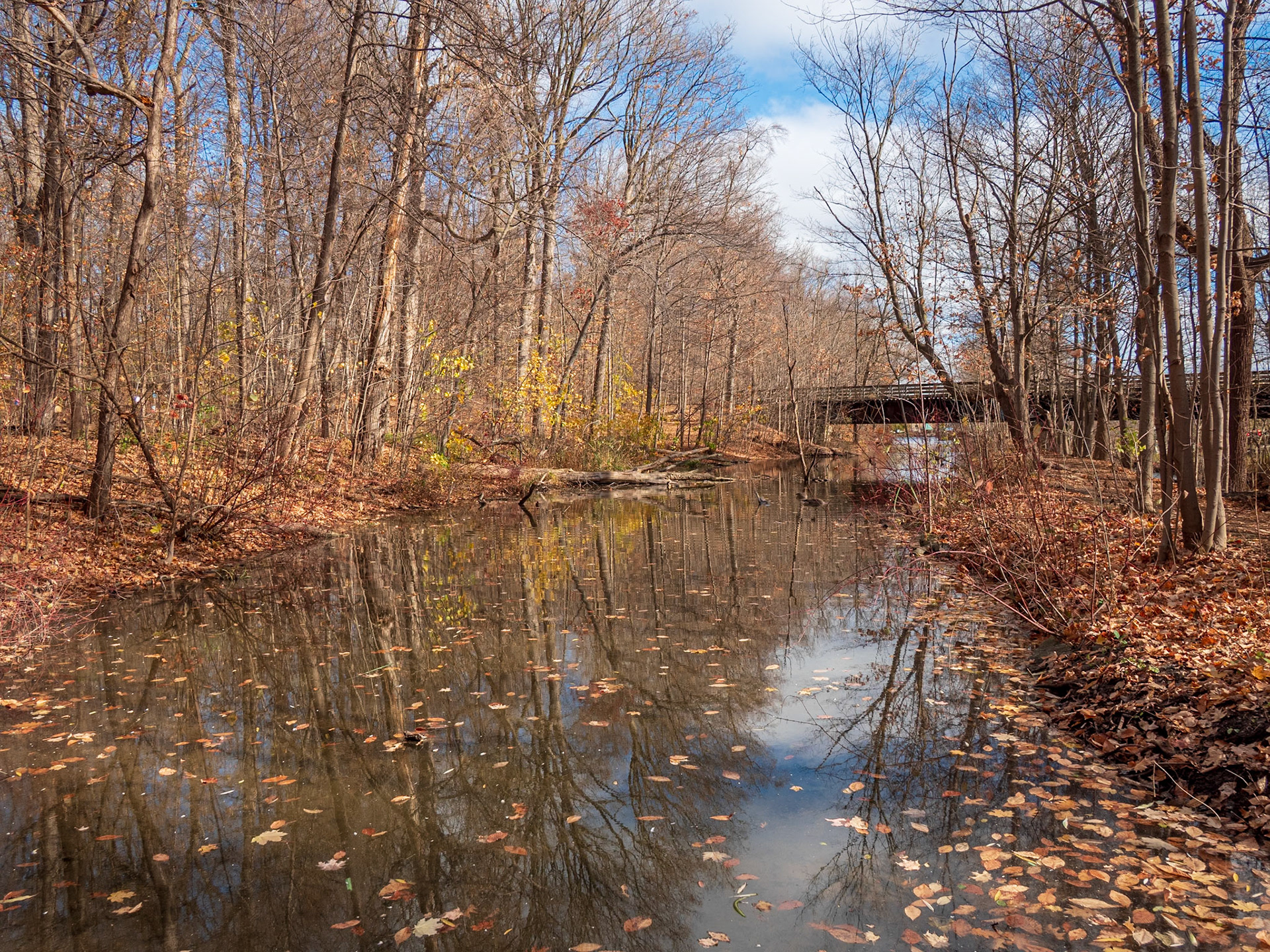 A bridge crosses the stream in this park scene in Oakville, Ontario.