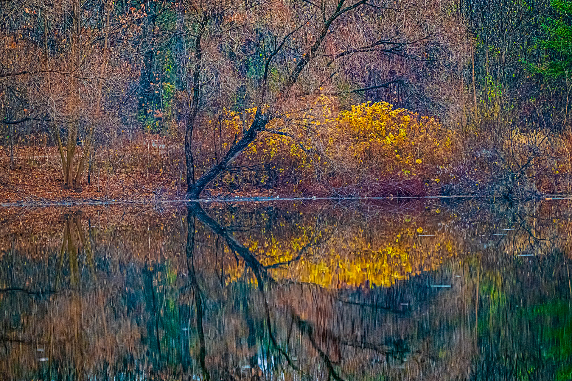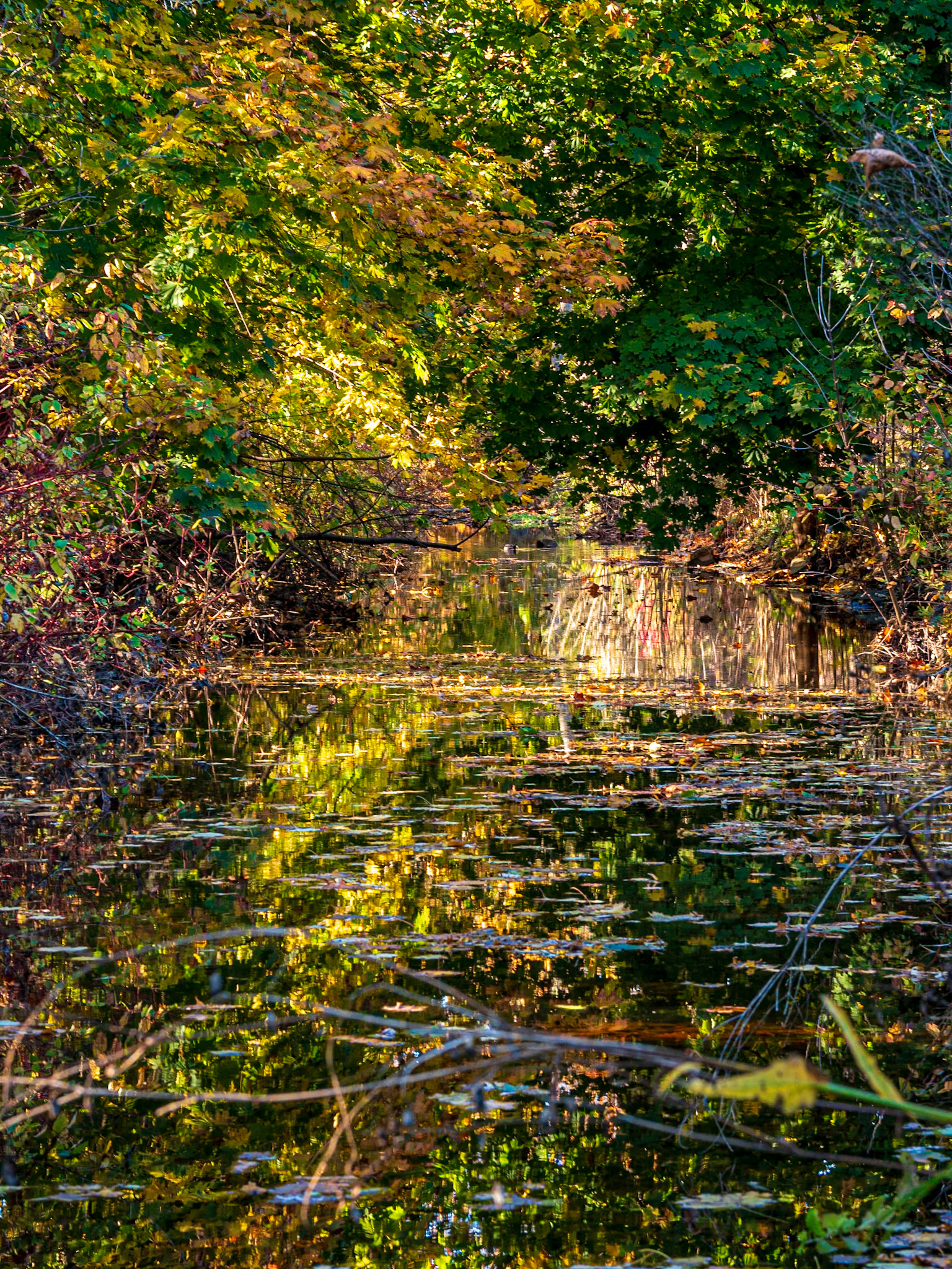 Reflections on a foggy fall day at Christie Lake near Hamilton, Ontario.